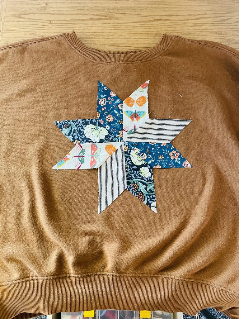 Make sure the star “block” is pressed nicely, and then lay your sweater out flat on the table. Position the star on the sweater and either pin it in place, or use a glue stick to really hold it down.