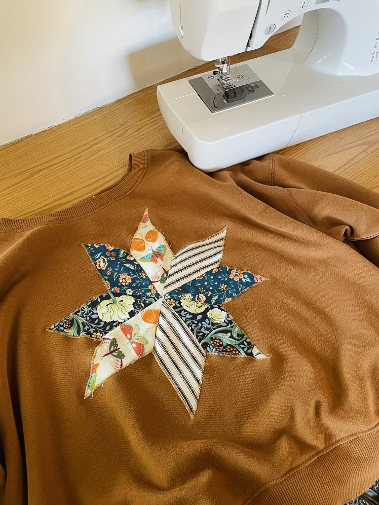 Plus, I have been obsessed with the quilted-everything trend lately, so I made a simple 8-pointed-star applique to cover the stains, and made my sweater wearable again!